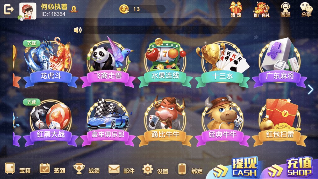 大厅含有多种游戏:包括炸金花、百家乐、斗地主、龙虎斗、德州扑克、百人牛牛、捕鱼达人、红黑大战、飞禽走兽、水果连线、十三水、广东麻将、红黑大战、豪车俱乐部、通比牛牛、经典牛牛、红包扫雷等。