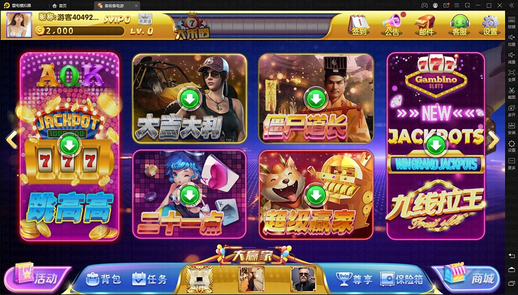 这套客拉客游戏平台,是使用网狐内核开发,大厅主界面功能布局好,包括有多种多样的功能,除了玩游戏以外,还可以参与大乐透抽奖活动,支持用户签到领金币等任务,内置有商城,另有尊享SVIP权限购买,可以根据玩家的喜好自行开通。